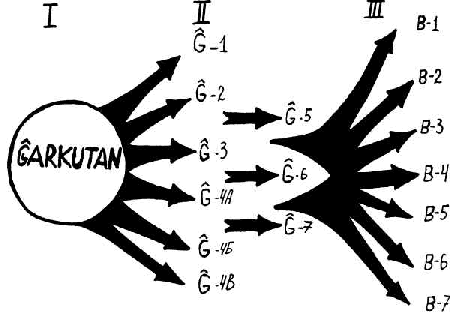 Kiel videblas el la historia topografio de Ĝarkutan, la triba dispartiĝo de loĝ-mastrumaj kvartaloj estas laŭgrade anstataŭata per la sociala-teritoria disiĝo (apartiĝintaj ekonomia akumulaĵoj, templo, palaco, loĝkvartaloj). La enterigaj kompleksoj transformiĝas el komun-familiaj, kvartalaj tombejoj (etapoj SAPALLI kaj Ĝarkutan I, 1750 - 1550 a.K.) en apartiĝintajn gentajn (etapoj Ĝarkutan II, KUZALI kaj MOLALI-BUSTAN, 1550 - 950 a. K.) kaj subgentajn nekropolojn (etapoj malfru-KUZALI kaj MOLALI-BUSTAN, 1250 - 950 a. K.) (Bildo 1).