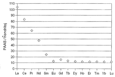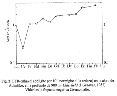 Do, negativan Ce-anomalion havas ankaŭ marakvo (Masuda & Ikeuchi, 1979), (Fig. 2). Konsidere al la nehomogeneco de oceanoj, Ce-anomalio mankas ekz. en Nigra maro (German k.a., 1991). Dum la reduktanta atmosfero en arĥeozoiko tamen ne okazadis – almenaŭ ne konsiderinde – oksidado al la trivalenta Ce, do ne ekzistis Ce-anomalio (Fig. 3).