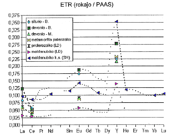 Male, preskaŭ certe eblas ekskludi troviĝon de Ce-anomalio en moldanubiko, kiu konsistas el forte metamorfitaj rokaĵoj, aŭtor-opinie malsupraproterozoikaj. Al Fig. 4 necesas rimarkigi, ke en la specimenoj el moldanubiko kaj el la moravia devonio tre ofte sub la detektolimo troviĝis Eu kaj Y; la nemezureblaj valoroj anstataŭiĝis per duono de la detektolimo, sed eĉ tiel ili povas esti pli eble supertaksitaj.