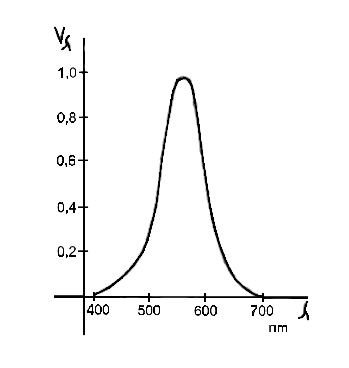 La maksimumo de la kurbo situas ĉe 555 nanometra ondolongo, kiu estas verd-flava lumo. Se troviĝus lumigilo, kiu povas radii nur en tiu ondolongo, per unu vato ĝi povus produkti 680 lumenojn. Tiu lumenvaloro estas povuma ekvivalento de la lumo (1 W = 680 L).