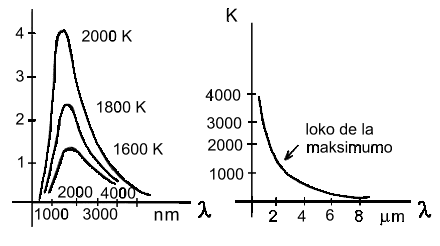 Estis evidente, ke ardanta solida korpo povas produkti la plej grandan lumon, kiam la temperaturo de la korpo estas laŭeble la plej granda. Tion formulas la leĝo de Wien: Per la altigo de la temperaturo de ardanta korpo, ties radiad-energio-maksimumo formigras al la direkto de pli mallongaj ondoj (fig. 2.).