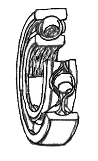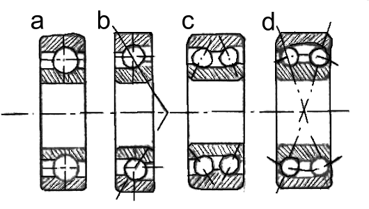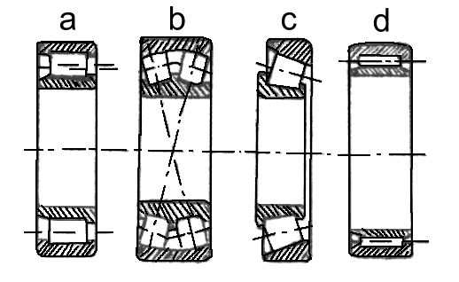 Bildo 296. Rul-lagroj. a - unuvica b - unuvica kun oblikva kontakto kun duvica globlagro. c - duvica kun oblikva kontakto d - duvica klinebla globlagro |