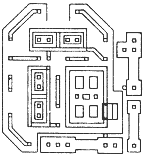 La realigo de la projektado de la cirkvito mem, tio estas la projektado de la vojo de konduktilo, estas simila al tiu de la presitaj cirkvitoj. Ĝia esenco estas, ke sur nigra-blanka filmo, enhavanta la kelkcentoble pligrandigitan bildon de la duonpreta cirkvito, oni surgluas per rubando kun dumilimetra larĝo la vojon de la konduktilo tiel, kiel videblas sur fig. 2. Ĝi bone ilustras, ke tiu ĉi duonpreta cirkvito enhavas 7x8=56 normigitajn unuojn. Sur la filmo jam estas pretaj ne nur la normigitaj unuoj, sed ankaŭ la gravaj partoj de la enigaj/eligaj unuoj.