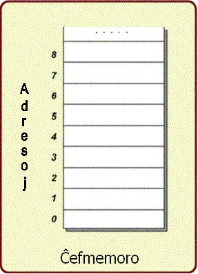 La ĉefmemoro konsistas el tre longa listo de bajtoj. En la plejmulto de modernaj komputiloj, ĉiu bajto havas adreson kies celo estas lokalizi la bajton mem. La ilustraĵo montras malgrandan parton de la ĉefmemoro:
