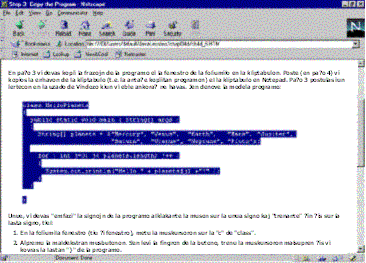 En paŝo 3 vi devas kopii la frazojn de la programo el la fenestro de la foliumilo en la kliptabulon. Poste (en paŝo 4) vi kopios la enhavon de la kliptabulo (t.e. la antaŭe kopiitan programon) el la kliptabulo en Notepad. Paŝo 3 postulas iun lertecon en la uzado de Vindozo kiun vi eble ankoraŭ ne havas. Jen denove la modela programo: