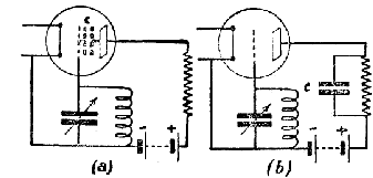 ![]() | Fig. 79. — La kapacito inter anodo kaj krado, punktlinie prezentita en (a), estas unufine konektita al la supra fino de la anoda rezistaĵo kaj alifine (tra la kradcirkvito kaj la anodbaterio, kies rezistanco estas nekonsiderinda) al la alia fino de l' anoda rezistaĵo, kiel tio estas montrita ĉe (b). |