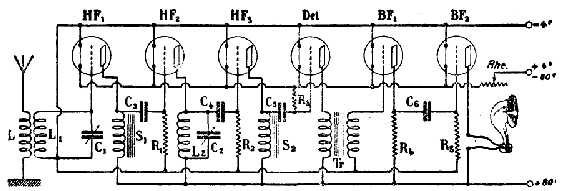 Fig. 81. — Skemo de ricevilo laŭ Scott-Taggart. La unua lampo estas kuplita kun la dua per agordita cirkvito, la dua kun la tria — neagordebla induktanco (kun fera kerno), la tria kun la kvara denove per agordita cirkvito. La kvara lampo estas detektoro (oni rimarku, ke la rezistaĵo ne ŝuntas la detektan kondensatoron, sed estas rekte kunligita kun la pozitiva poluso de la filamenta baterio). La kvina lampo estas malaltfrekvenca amplifikatoro transformatore kuplita. |