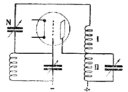 RAD. Nun rigardu la skemon, kiun mi ĉi tie desegnas (fig. 83). Vi vidas ke la kutima bobeno II de la anoda cirkvito havas kvazaŭ voston I, tio estas alia bobeno kuplita al ĝi. Tiu ĉi vosto estas konektita al la krada agordcirkvito pere de malgrandkapacita variebla kondensatoro N, nomata neŭtrodina kondensatoro. Nun, kio okazas en la bobeno I, kiam la bobenon II trafluas altfrekvenca kurento?