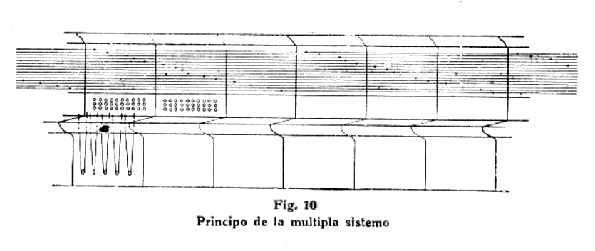 La multiplaj ĵakoj okupas la superan parton de la telefonŝranko, kaj ili estas aranĝitaj tiamaniere, ke ĉiu telefonistino povas atingi multiplan ĵakon de ĉiu aboninto de la centralo. Por tiu celo estas necese, ripeti la multiplajn ĵakojn kelkafoje. Ne estas bezone, ke la multipla ĵakaro aperu antaŭ ĉiu oficistino, ĉar ĉiu fraŭlino povas atingi ankaŭ la ĵakojn, kiuj troviĝas antaŭ ŝiaj du najbarinoj. Sufiĉas do, ke oni ripetu la multiplan ĵakaron antaŭ ĉiu grupo de tri telefonistinoj. Ekzemple, se estas 3000 abonintoj kaj ĉiu telefonistino povas servi la alvokojn de 200 abonintoj, oni bezonas 15 oficistinojn. La multipla ĵakaro estas ripetata antaŭ ĉiu grupo de tri telefonistinoj, do kvin fojojn. Oni devas atenti, ke nun ĉiu telefonistino faras la alvokon de la dezirata aboninto per la multipla ĵako, ankaŭ se ŝi havas antaŭ si la alvokan ĵakon de la sama aboninto. En skema maniero la figuro 10. klarigas la principon de la multiplaj ĵakoj. Oni vidas, ke la multiplaj ĵakoj estas ripetataj antaŭ ĉiu grupo de tri tabloj.