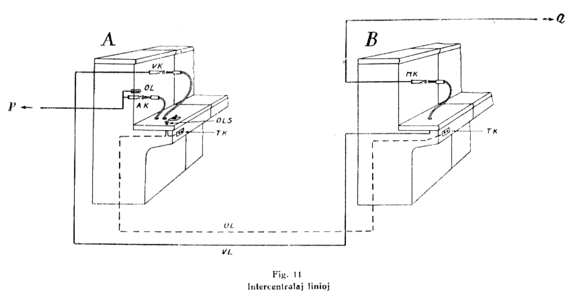 Figuro 11. montras skize, kiel la sistemo funkcias. La A-telefonistino estas la telefonistino, kiu respondas al la alvoko, kiu sin anoncas per la ekbrulo de la alvoka lampeto OL. Ŝi prenas ŝtopilon kaj metas ĝin en la ĵakon AK, kiu apartenas al la sama linio, kaj puŝante la ŝaltilon de la koncerna ŝnuro, ŝi povas paroli kun la alvokanta aboninto. Ŝi ekscias la deziratan numeron kaj do scias, ke la aboninto deziras paroli kun iu sinjoro, konektita al alia centralo. Ŝi havas antaŭ si la ĵakojn VK de certa nombro da intercentralaj linioj VL, kiuj kondukas al la tablo de B-telefonistino en la alia centralo. Sed la samaj linioj ankaŭ povas esti uzataj (en maniero, kiu ne estas montrita en la figuro), de aliaj telefonistinoj en la A-centralo, kiuj ankaŭ deziras konekti kun la sama B-centralo. Por provi, kiu linio estas libera, oni sekvas plej ofte la sistemon de la tielnomataj komandolinioj. Tiuj estas apartaj linioj OL, kiuj interligas nur la telefonistinojn de diversaj centraloj inter si, kaj kiuj estas uzataj por demandi al la B-telefonistino, kiu intercentrala linio estas libera. La A-telefonistino komunikas al la B-telefonistino la deziratan numeron, tiu ĉi lasta, ripetas la numeron kaj indikas la numeron de la intercentrala linio, per kiu la konekto povas esti farata. La A-telefonistino konektas la vokintan aboninton al tiu intercentrala linio kaj en la sama momento la B-telefonistino la intercentralan linion al la linio de la dezirata aboninto, kies multiplan ĵakon MK ŝi trovas en la multipla ĵakaro. Se la aboninto estas okupita, ŝi raportas tion. Post la fino de la konversacio la abonintoj remetas la telefonilojn sur la hokojn, kaj pro tio eklumas lampetoj, kiuj avertas la telefonistinojn, ke ili povas forpreni la ŝnurojn. En figuro 11. TK estas ĵako, al kiu per ŝtopilo estas konektata la telefonilo de la telefonistino. Kiam la A-telefonistino puŝas la ŝaltilon OLS, ŝi povas senpere paroli kun la B-telefonistino per la linio OL.