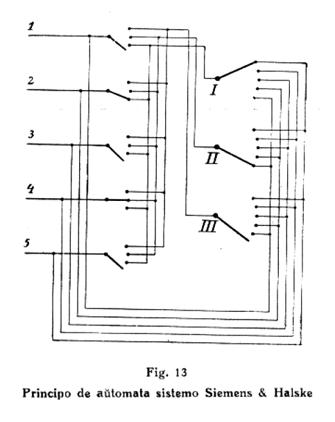 En la sistemo de Siemens & Halske la meĥanismo nun funkcias proksimume jenmaniere: Ĉiu aboninto havas je sia dispono en la centralo malgrandan antaŭelektilon, kiu estas daŭre konektita kun lia linio. Tiu antaŭelektilo povas fari nur turnantan movon, kaj tial ĝi estas multe malpli kosta ol la grandaj elektiloj. Turnante sin, la antaŭelektilo povas okupi dek diversajn poziciojn kaj en ĉiu pozicio ĝi konektas la linion de la aboninto al alia granda elektilo. Kiam la aboninto levas la telefonilon de la hoko, la antaŭelektilo ekturniĝas aŭtomate kaj serĉas konekton al elektilo, kiu estas en tiu momento libera. Nur atinginte la vojon al tia libera elektilo, la antaŭelektilo haltas. Estas entute 100 abonintoj, kies antaŭelektiloj devas elekti el la sama grupo de 10 elektiloj. La ideo estas skeme montrata de la figuro 13. Oni devas nur atenti, ke la linioj de la abonintoj estas desegnitaj nur per unu streko, kaj ke ankaŭ la grandaj elektiloj estas desegnitaj tiel, kvazaŭ ankaŭ ili povus fari nur turnantan movon. Ankaŭ la nombroj estas malpli grandaj ol en la praktiko. Maldekstre alvenas kvin linioj de abonintoj, kiuj ĉiuj havas sian antaŭelektilon. La antaŭelektiloj havas la elekton inter tri grandaj elektiloj. La abonintoj 1, 3 kaj 5 ne telefonas, do iliaj antaŭelektiloj estas en la ripoza pozicio. La aboninto 2 levis la telefonilon, kaj lia antaŭelektilo elektis la unuan elektilon, indikitan per I. La aboninto 4 ankaŭ deprenis la telefonilon de la hoko, sed lia antaŭelektilo trovis la unuan elektilon okupita, kaj ĝi do preterpasis ĝin kaj elektis la elektilon II. La abonintoj nun turnas la diskojn kaj relasas ilin, tiel ke la mikrofona fluo estas interrompata kelkfoje. Laŭ la figuro ni vidas, ke la aboninto 2 elektis la ciferon 5, tiel ke la elektilo faris kvin paŝojn. La elektilo II faris nur unu paŝon, do la aboninto 4 elektis la ciferon 1. Oni do vidas, ke la aboninto 2 vokas la aboninton 5 kaj ke same 4 vokas 1.