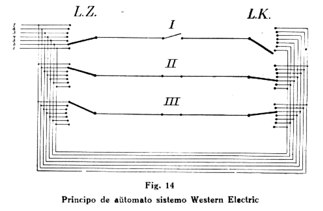 La figuro 14. skize klarigas tiun ĉi sistemon. En tiu ĉi figuro estas montrite, ke sep linioj de abonintoj estas ligataj al la kontaktoj de tri serĉiloj LZ. Kiam unu el la abonintoj deprenas la telefonilon de la hoko, ĉiuj el tiuj tri serĉiloj, kiuj estas liberaj, turniĝas kaj serĉas la vokantan linion. La serĉilo, kiu unue atingas tiun linion, okupas ĝin, kaj la aliaj turniĝantaj serĉiloj ankaŭ haltas. La serĉiloj ne havas komencan pozicion: ili restas, kie ili lastfoje funkciis. La ŝanco, ke vokanta linio estas tuj kaptata de apude staranta serĉilo, do estas tre granda. Kiam la linio de la aboninto estas kaptata de serĉilo, la tuta konekta cirkvito, al kiu tiu ĉi serĉilo apartenas, estas je la dispono de la aboninto, kiu komencas turni la diskon sur sia aparato. En la figuro tio estas indikita per la fermo de la ŝaltilo inter la serĉilo kaj la elektilo. La dua kaj la tria konektaj cirkvitoj do estas okupataj; la unua estas libera. La elektiloj LK nun estas movataj sub la influo de la turniĝanta disko en analoga maniero kiel en la sistemo de Strowger.