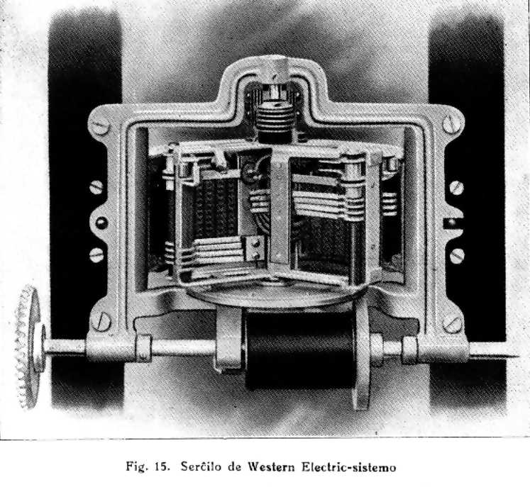 En la praktiko la nombro de la linioj, ligitaj al unu serĉilo aŭ elektilo, kompreneble estas alia ol en la figuro. La serĉiloj havas kontaktaron, kiu enhavas 60 kontaktojn. Tia serĉilo estas montrata en la figuro 15. La horizontala akso ĉiam turniĝas pere de la maldekstre videbla dentrado kaj kun ĝi la disko, kiu estas videbla dekstre de la elektromagneto. Kiam tiu elektromagneto altiras la flekseblan grandan horizontalan diskon, la tuta serĉilo estas kunprenata.