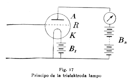 La figuro 17. montras la principan ŝaltmanieron de la trielektroda lampo. B1 estas la baterio, kiu hejtas la katodon K; B2 estas la baterio, kiu subtenas la tension inter la katodo kaj la anodo. Inter la katodo kaj la anodo troviĝas la krado R. La elektronoj, kiuj forlasas la katodon, grandparte penetras tra la maŝoj de la krado kaj povas tiamaniere atingi la pozitivan anodon, kiu altiras ilin. Oni observas, ke la forteco de la fluo inter la katodo kaj la anodo estas tre multe influata de la tensio de la krado rilate al la katodo. Ni jam vidis, ke tiu fluo estas influata de la tensio inter la anado kaj la katodo, sed evidentiĝas, ke la tensio de la krado havas multe pli grandan influon ol tiu de la anodo. Oni facile komprenas tion, kiam oni pripensas, ke se la krado estas negativa rilate al la katodo, ĝi repuŝas la negativajn elektronojn, dum ke pozitiva krado subtenas la altiran forton de la anodo. El tio sekvas ankaŭ, ke malgrandaj varioj de la tensio de la krado relative multe variigas la fluon al la anodo. Tiu eco estas esenca por la trielektroda lampo. Ĝi signifas, ke la lampo povas pligrandigi la amplitudon de elektraj vibradoj aŭ alternaj fluoj kaj ke ĝi do funkcias kiel plifortigilo de fluoj aŭ amplifilo. Grava estas la fakto, ke la lampo plifortigas aŭ amplifas la fluojn tute proporcie, tio estas, ke la plifortigitaj fluoj estas ĉiumomente tute proporciaj al la plifortigotaj fluoj. Tio signifas, ke la alternaj fluoj ne estas aliformigataj de la lampo, kio estas tre grava por la reprodukto de vibradoj, kiuj reprezentas la voĉon.