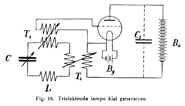 Estas ankoraŭ tria tre grava maniero, uzi la trielektrodan lampon. La koncerna metodo estas bazita sur la amplifo. Kiam oni konektas la trielektrodan lampon laŭ la skemo, montrita en figuro 18., ĝi povas naski ne amortizitajn elektrajn vibradojn, kaj oni tial diras, ke ĝi funkcias kiel generatoro de ne amortizitaj vibradoj aŭ ondoj. La teorio de tiu ĉi generatoro estas la jena: la kondensatoro C kaj la memindukto L kun la bobenoj de la du transformatoroj T1 kaj T2 formas elektran cirkviton, kiu en la konata maniero povas fari elektrajn vibradojn aŭ oscilojn. Oni imagu, ke pro ia kaŭzo tre malforta oscilo estu naskata en la nomita cirkvito. Per la transformatoro T1 tiuj osciloj influas la tensian diferencon inter la katodo kaj la krado de la lampo. La lampo funkcias kiel amplifilo, do la konsekvenco estas, ke en la cirkvito, formata de la katodo, la anodo kaj la baterio Ba, naskiĝas iom plifortigitaj osciloj. En kelkaj okazoj oni aldonas kondensatoron C1, paralele al la baterio, por doni pli facilan vojon al la osciloj, ol la baterio povas proponi. Oni vidas, ke la laste nomita cirkvito entenas ankaŭ la primarion de la dua transformatoro T2, kies sekundario estas parto de la oscilanta cirkvito. En tiu ĉi okazo oni diras, ke la anoda cirkvito de la lampo estas reakcie kuplita al la origina oscila cirkvito. La sekvo estas, ke la iom plifortigitaj osciloj denove influas la unuan cirkviton, kie ili do plifortigas la originan vibradon. Tiu ĉi lasta siavice pli forte influas la tensian diferencon inter la katodo kaj la krado, kaj tiuj pli fortaj osciloj do denove estas plifortigataj. Oni facile komprenas, ke per tia cikla procedo daŭrantaj, sufiĉe fortaj vibradoj estas naskataj. La amplitudo de la vibradoj ne kreskas senlime pro tio, ke ankaŭ la perdoj kreskas, kaj oni do atingas ekvilibran staton, kie la anoda baterio liveras tiom da energio, kiom estas konsumata de la perdoj. Pro tio la ondoj estas ne amortizitaj.