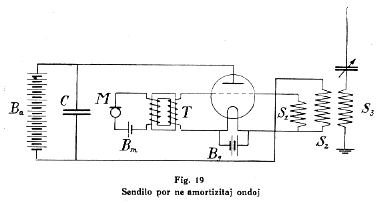 La figuro 19. montras simplan skemon de sendilo por ne amortizitaj ondoj. Bg estas la baterio, kiu hejtas la katodon de la lampo. Se en la bobeno S1 malforta elektra oscilo naskiĝis, tiu ĉi influas la tensian diferencon inter la katodo kaj la krado. Tiuj osciloj estas amplifataj en la lampo, kaj do ekzistas pli fortaj osciloj en la cirkvito de la anodo, la baterio Ba kaj la kondensatoro C, la bobeno S2 kaj la katodo. Kiel oni vidas, la bobeno S2 estas reakcie kuplita kun la bobeno S1, kaj do ĉiuj kondiĉoj por la naskiĝo de ne amortizitaj vibradoj ĉeestas. Tiuj vibradoj estas transdonataj al la cirkvito de la anteno, kiu do elradias ne amortizitajn ondojn.
