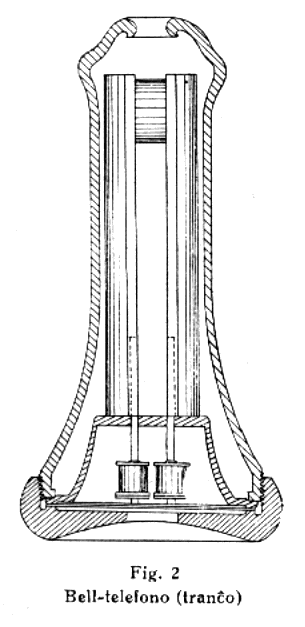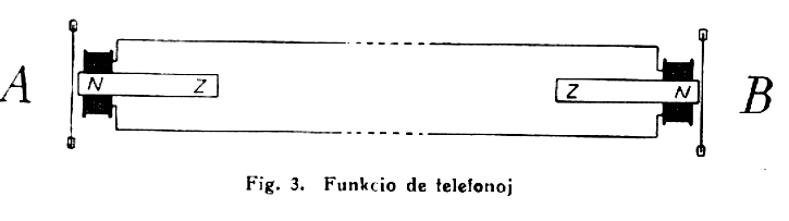 Esence la telefono de Bell, kiu kun malgrandaj ŝanĝoj estas uzata ankoraŭ nun (vidu figurojn 1. kaj 2.), konsistas el ŝtalmagneto, kiu portas malgrandan bobenon kun kupra fadeno kaj kontraŭ kies fino troviĝas fera membrano, kiu povas libere vibradi. La telefono povas funkcii kiel sendilo kaj ricevilo, kiam oni interligas la fadenojn de la du bobenoj (fig. 3.). La vibradoj de la unua membrano naskas malfortajn elektrajn fluojn en la unua bobeno. Tiuj fluoj estas kondukataj al la dua bobeno, kie ili plifortigas aŭ malplifortigas la altirforton de la magneto, tiel ke tiu ĉi lasta vibrigas la duan membranon, kiu reproduktas la aervibradojn de la voĉo.