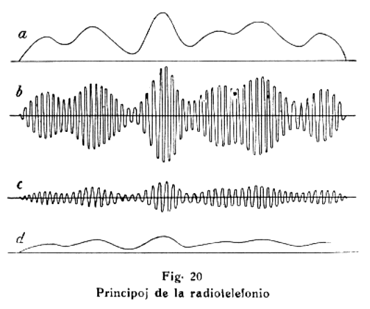 La ne amortizitaj ondoj ankaŭ povas esti uzataj por la telegrafado. Por tiu celo oni aranĝas la aparatojn tiamaniere, ke dum la tempdaŭro de la punktoj kaj strekoj de la Morse-alfabeto la ne amortizitaj ondoj estas elsendataj kaj ne dum la ripozaj periodoj inter la elementoj de la literoj. Por la senfadena telefonio la cirkonstancoj estas iom diferencaj. Kiel oni scias, la kurbo, kiu reprezentas la sonon de la homa voĉo, estas sufiĉe komplika kaj ŝajne ne regula. Tamen oni rekonas la periodecon, precipe en la vokaloj. Oni imagu, ke la kurbo "a" en la figuro 20. reprezentu parton de homa parolo. La frekvenco, kiun oni rimarkas en tiu kurbo, estas tiu, kiu karakterizas la altecon de la sono de la voĉo. Per tiaj vibradoj oni devas influi la ne amortizitajn aŭ kontinuajn ondojn, kiuj estas elsendataj de la sendstacio por Radiotelefonio. Tiu influo konsistas el tio, ke la vibradoj ŝanĝas la fortecon, do la amplitudon de la ondoj. Tio estas montrita en la kurbo "b" de la figuro 20. La frekvenco de la ne amortizitaj ondoj estas evidente multe pli alta al tiu de la homa voĉo, kaj ĝi restas konstanta. Sed samtempe la amplitudo de la vibradoj varias laŭ la formo de la supra kurbo. La elsenditaj ondoj de la sendstacio estas ricevataj de iu ricevaparato, kaj la vibradoj, kiuj naskiĝas en la cirkvitoj de la ricevilo, estas tute konformaj al la elsenditaj ondoj. Nur la forteco estas multe pli malgranda. La kurbo "c" donas imagon pri tiu ricevita vibrado.