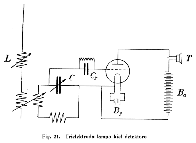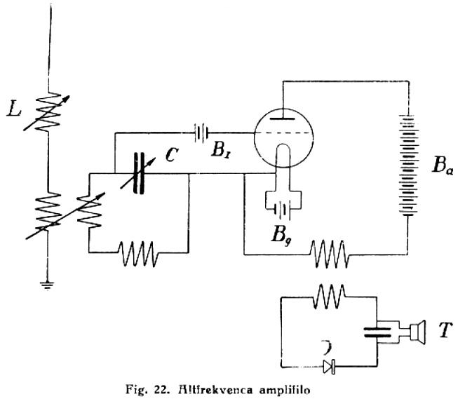 Kiel la trielektroda lampo povas funkcii kiel altfrekvenca amplifilo, estas montrate en la sekvanta skemo figuro 22. Komparante tiun ĉi skemon kun la antaŭa, oni rimarkas, ke ambaŭ estas tre similaj unu al la alia. Nur la krada kondensatoro estas anstataŭita de malgranda baterio Br, konsistanta el kelkaj sekaj elementoj, kiujn oni nomas la krada baterio. La krada baterio zorgas, ke la tensio de la krado estas ĉiam iom negativa rilate al la katodo, kaj pro tio neniu elektrono povas iri al la krado. La tielnomata krada fluo do estas daŭre nula. Sub tiuj kondiĉoj la lampo plej bone funkcias kiel amplifilo, ĉar la anoda fluo varias tute proporcie kun la tensio de la krado. Oni vidas ankaŭ, ke la cirkvito de la anodo estas kuplita al aparta cirkvito kun kristaldetektoro. Kompreneble oni en tiu ĉi okazo povas uzi duan lampon kiel detektoron, sed ni elektis tie ĉi la kristalan detektoron, por ne fari la skemon tro komplika.