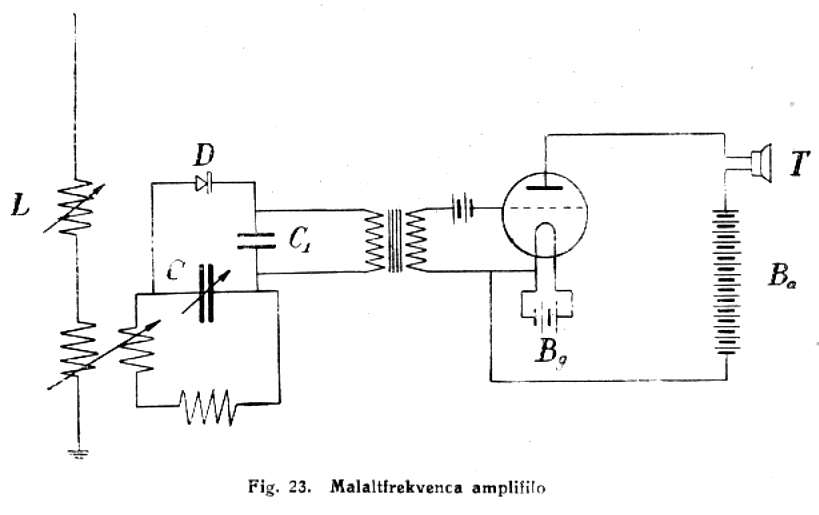 Kiel la trielektroda lampo povas funkcii kiel malaltfrekvenca amplifilo, estas videble per la skemo de la figuro 23. Denove ni supozis, por teni la skemon simpla, ke la detektoro estas kristalo. En la loko, kie oni konektas en simpla kristalricevilo la telefonon, konektoj estas faritaj al la primario de kupla transformatoro. La sekundario de tiu ĉi transformatoro estas konekt ita al la katodo kaj al la krado de la lampo, al la lasta tra krada baterio. La lampo do denove funkcias kiel amplifilo, en tiu ĉi okazo kiel malaltfrekvenca.