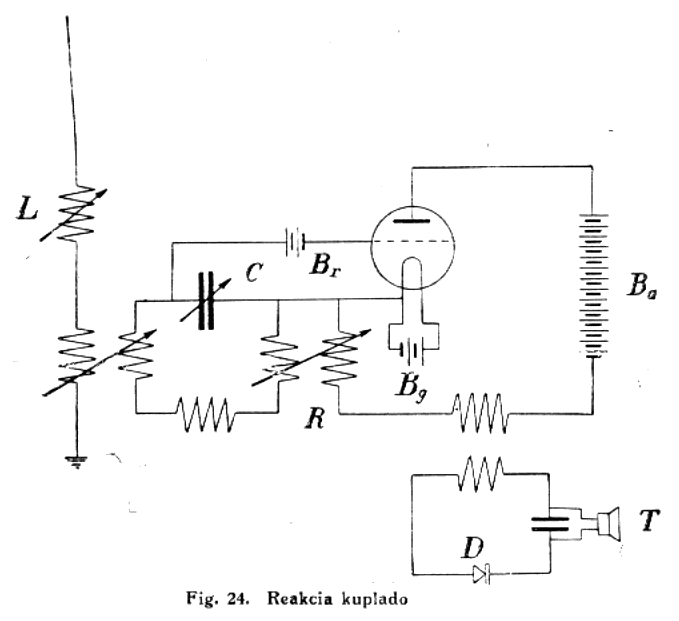 Ni montras ankoraŭ kvaran skemon en figuro 24., kiu estas tre simila al tiu de figuro 22. Evidente la nura diferenco estas en tio, ke en la nova skemo ekzistas kupla transformato inter la cirkvito kun la kondensatoro C kaj la cirkvito de la anodo. Pro tio la kondiĉoj estas plenumitaj, kiuj ankaŭ ekzistas en la skemo de figuro 18., t. e. la lampo povas funkcii kiel generatoro. Oni nomas tian kupladon reakcia kuplado. Se la kuplado estas forta, la cirkvito naskas ne amortizitajn vibradojn, kaj oni diras, ke la lampo generas. Tamen por la ricevo de telefonio oni devas zorgi, ke la lampo ne generas, ĉar pro interfero kun la tielnomata portanta ondo de la telefonio ekestus sonoj, kiuj konfuzigus la ricevotajn sonojn. Oni do tiel adaptas la reakcian kupladon, ke la lampo precize ne ankoraŭ generas. Tiam oni havas la maksimuman profiton de la reakcio sen la ĝenanta generado. La lampo do en tiu ĉi okazo ne produktas mem vibradojn, sed ĝi tute kompensas la perdojn, kiujn la alvenantaj vibradoj suferas en la cirkvitoj, kaj tiamaniere oni havas pli fortan amplifon, ol kiam oni forlasas la reakcian kupladon.