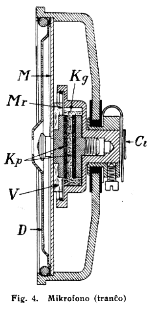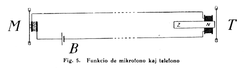La principo de la komuna funkciado de la mikrofono kaj telefono estas la jena: pro la vibradoj de la membrano la karba pulvoro estas alterne pli kaj malpli premata, kaj pro tio varias la elektra rezisto de la pulvoro. La elektra fluo de kelkaj elementoj (fig. 5.) estas kondukata tra la karba pulvoro, kaj pro la varianta rezisto de la pulvoro ankaŭ varias la forteco de tiu fluo. La fluo estas kondukata tra la bobeno de telefono, kie ĝi laŭ la jam priskribita metodo reproduktas la vibradojn de la mikrofono.