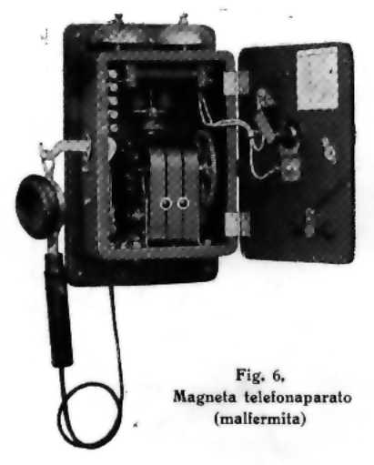 Por tiu averto servas sonoriloj, kiuj por malgrandaj distancoj estas samspecaj, kiel la konataj elektraj sonoriloj, funkciantaj per la kontinua fluo de kelke da elementoj. Se la distanco estas pli granda, estas necese, uzi sonorilojn, kiuj funkcias per alterna fluo, kaj tiu ĉi lasta devas esti produktata de malgranda generataro, muntita en la telefona aparato kaj movata per malgranda turnilo (fig. 6.). La fluoj, uzataj por la alvoko, devas ankaŭ esti kondukataj de kupraj fadenoj, kaj estas kompreneble, ke pro ekonomio oni uzas por tiu celo la samajn fadenojn, kiuj ankaŭ servas por la transporto de la telefonaj fluoj. Ne estas dezirinde, ke la fadenoj povu esti uzataj en la sama momento por la du celoj, kaj tial la aparatoj ricevas ankoraŭ ŝaltilon, kiu alterne povas fermi la cirkviton por la telefonaj kaj por la sonorilaj fluoj. Tiu ŝaltilo estas kombinata kun la hoko, kiu portas la telefonon dum la tempo, kiam ĝi ne estas uzata; la meĥanismo do estas tia, ke dum la tempo, kiam la aparato estas ekster funkcio, nur la sonorilaj fluoj povas trairi la linion; kaj kiam oni dehokigas la telefonon, nur la telefonaj fluoj povas trapasi la fadenojn. Se ni ankoraŭ aldonas malgrandan transformatoron por la plifortigo de la mikrofonaj fluoj, la inventaro de la telefona aparato estas kompleta. Laŭ la generatoro, kiu liveras la alternan fluon por la sonoriloj kaj kiu enhavas kelkajn ŝtalmagnetojn, oni nomas la aparatojn de la priskribita sistemo magnetaj aparatoj. Ili estas tute sufiĉaj por la komunikoj inter du lokoj, eĉ se tiuj troviĝas en distanco de kelkaj kilometroj.