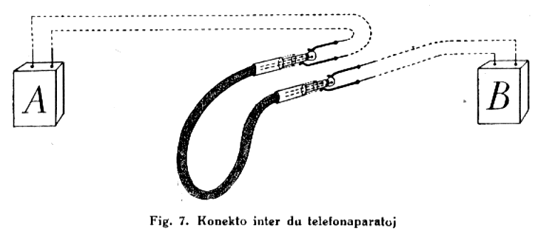 La ĉefa rimedo, per kiu la oficistinoj en la centraloj interligas la liniojn de la partoprenantoj, estas fleksebla ŝnuro, kiu enhavas interne du izolitajn kuprajn fadenojn, kiuj servas por konekti la du liniojn de la abonintoj. Por facile fari tiajn konektojn, la ŝnuroj finiĝas per ŝtopiloj, kiuj estas metataj en tielnomatajn ĵakojn, tio estas tubetoj, en kiuj troviĝas risortoj, kiuj faras la necesajn kontaktojn. La figuro 7. montras en skema maniero, kiel konekto inter la aparatoj A kaj B de du abonintoj estas farata. La telefonistino havas antaŭ si ŝrankon, sur kies antaŭa vando troviĝas unu ĵako por ĉiu aboninto, kaj en tiuj ĵakoj finiĝas en risortoj la du fadenoj, kondukantaj al la aparato de la partoprenanto. Per ŝnuro kun du ŝtopiloj la telefonistino povas interligi kiujn ajn liniojn de abonintoj.