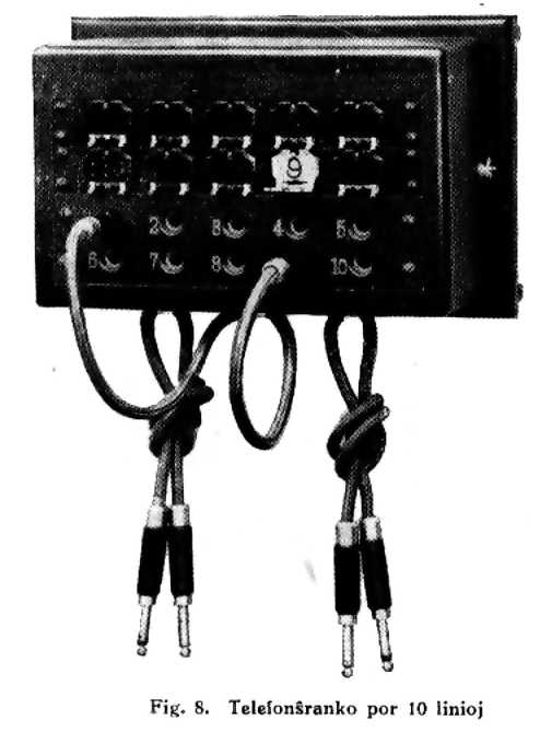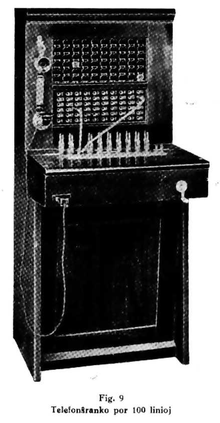 Figuro 9. montras telefonŝrankon aranĝitan laŭ tiu ĉi sistemo. Supre oni vidas la klapojn de la signaloj por la alvoko kaj por la malkonekto. Sub tiuj klapoj troviĝas la ĵakoj, unu por ĉiu linio de aboninto. Sur la tableto staras la ŝtopiloj, ligitaj al la ŝnuroj, kiuj estas kovrataj de la antaŭa breto de la ŝranko. La ŝnuroj portas pezilojn, kiuj ilin tiras malsupren, tiel ke la ŝtopiloj refalas en siajn normalajn poziciojn, kiam oni delasas ilin. Antaŭ la ŝtopiloj troviĝas la ŝaltiloj, per kiuj oni povas konekti kun kiu ajn ŝnuro la mikrotelefonon, videblan maldekstre. Ĉe la dekstra flanko de la tablo oni vidas la turnilon de la generatoro, per kiu la telefonistino sendas la sonorilan fluon.
