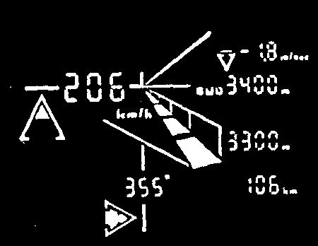 La indicoj de ĝisflugo (la ĝisgliso), kiel vidas ilin glisisto sur la indikilo: la sportglisilo flugas en alto 3400 per kurso 355°, por atingi celon malproksiman 106 km super la ...(?)... dum alta rezervo de 100 m super la tereno devas la piloto altiri la stirstangon (t.e. flugi malpli rapide) kaj samtempe ĝiri dekstren, por ke li akiru la ĝustan kurson: li descendas per 1,5 m/s, la sageto kaj signo (minuso) montras vertikalan movon de la sportglisilo, la du sagetoj je ŝanĝebla grandeco la deviojn.