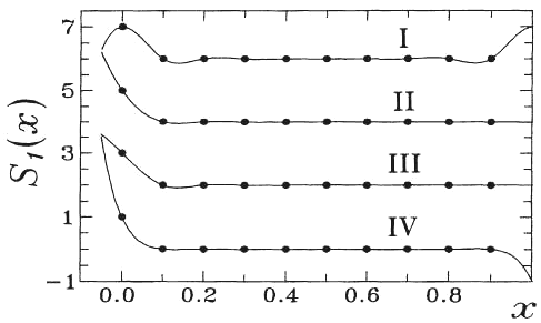 | Fig. 3. Bazaj funkcioj (I-IV) por L=10 kaj j=5. |
