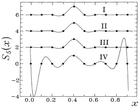 Kompreneble, ke ekzistas senfina nombro da funkcioj havantaj tian ĉi proprecon, kaj ĉiaj tiaj funkcioj povas esti uzataj por la aproksimado. Tamen, se ni fiksus klason de funkcioj, la bazaj funkcioj ekestus determinataj. Se Sj(x) estas splajno, la linia kombinacio (3) estas ankaŭ la splajno de la samaj valoroj de n kaj