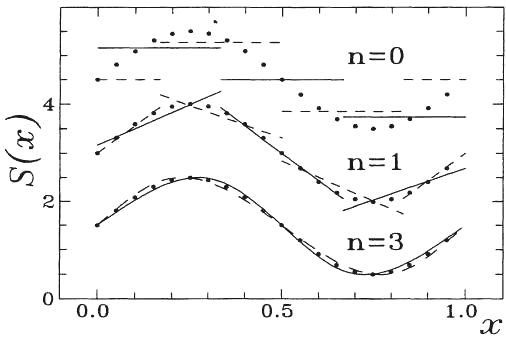 | Fig. 5. Splajnoj (n=0, k=1; n=1, k=2; n=3, k=1) aproksimantaj la "testan" sinuson determinatan en 20 punktoj. Du kurboj estas desegnitaj por diversaj valoroj da "komenca epoko". |