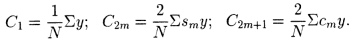 kie L=2M+1, sm=sin(2πmx), cm=cos(2πmx) (argumentoj estas transformitaj tiel, ke la periodo P=1), la koeficientojn Cj oni povas komputi, solvante sistemon de liniaj ekvacioj: