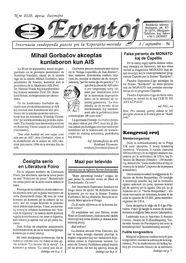 - Antaŭ la interreta epoko dum 10 jaroj ni eldonis la novaĵgazeton Eventoj, kiu per sia 2-semajna (!) aperritmo estis tiam la plej ofta Esperanto-informilo. Ĝi havis abonantojn en pli ol 65 landoj...