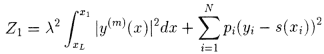 kie pi estas ia "kontribua koeficiento" dependa de precizeco de valoro yi; potenco de derivato m estas 2 (Marĉuk 1980) aŭ 3 (Vondrak 1969, Picchio 1981); λ2 — ia parametro karakterizanta gradon de aproksimeco inter punktoj kaj aproksimanta kurbo. Se λA2=0, la "glatiga" funkcio estas interpolanta splajno (kun "karakterizaj punktoj" ĉe la samaj argumentoj, kiel "eksperimentaj punktoj"). Se λ2≠0, la funkciaj valoroj ĉe "karakterizaj punktoj" estas variigitaj, kaj la splajno interpolas tiujn "korektitajn" punktojn. En tiu ĉi metodo ne estas tute klara la fizika senco de la parametroj λ2 kaj p1. Variigante ĝiajn valorojn, oni povas komputi multajn splajnojn, tial estas necese ellabori konkretajn kriteriojn por tio.