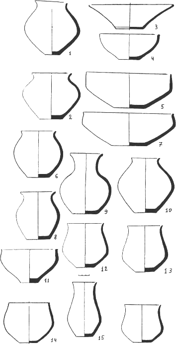 Bildo 6. Ceramikaj ujoj el tombo N 165 (Ĝ-4B) de la bustana tempo, kiuj kopias la formojn de la frua ĝarkutana etapo (la fenomeno de la renaskiĝo de la arkaikaj tradicioj).