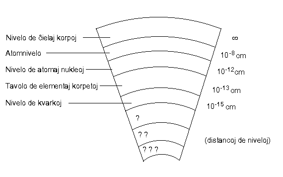 La diversaj niveloj de materia ekzistado. La ciferoj montras la limojn, inter kiuj la leĝoj validas sur la konkreta nivelo (4).