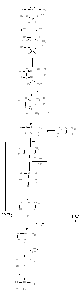 | Fig. 5 montras la etapojn de glikolizo el glukozo ĝis la lakta acido (Csányi, 1973) |