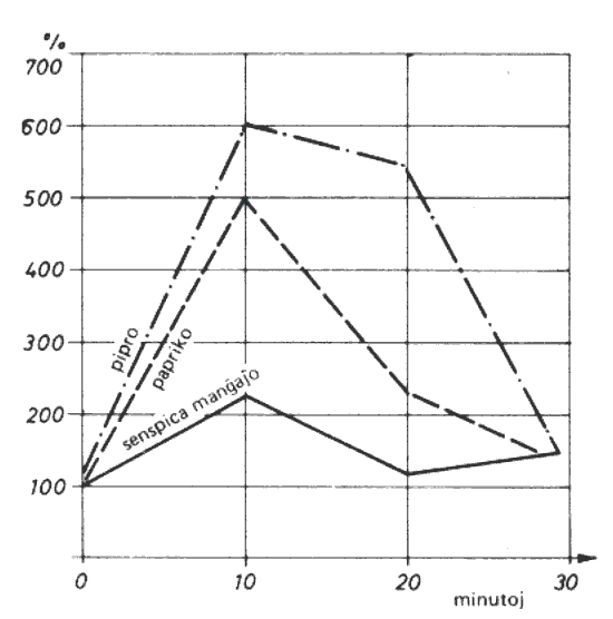 Fig. 1 montras la mezuron de salivsekrecio ĉe konsumado de ne-spicita, kaj - per pipro kaj papriko - spicita manĝaĵo.