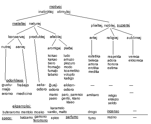d. P. M. Walter (Dragoco 1971) faras pluan paŝon kaj rilatigas la odorojn al homaj motivoj. La influo de la feromon-ekkono estas evidenta. Walter aludas la piramidon de la deziroj: la homoj kontentigas unue iliajn bazajn bezonojn kiel transvivado kaj sinreproduktado (laŭ la sentenco malsato kaj amo movadas la mondon), tiam sekvas la amuzado kaj nur pli poste la t.n. superaj, noblaj motivoj. Bonvolu konsideri tiun deduktan aŭ hierarkian skemon ne strikta, sed nur kiel diskutproponon.