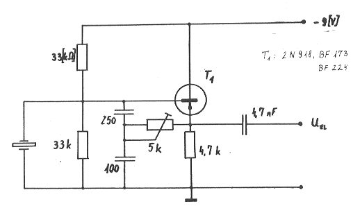 La vibroceramiko funkcias kiel paralela oscil-cirkvito per kondensatoroj C1 kaj C2, kiuj formas kapacitan tensiodividilon el la vidpunkto de emitero (aŭ emisiilo?). De la "varma" punkto de emitercirkvita rezistilo ni ricevas proksimume 2,5 V oscilatortension, la rekuplan tension oni povas agordi per la 5 kilooma reostato.