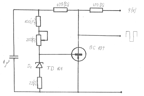 La tuneldiodon kaj la transistoron ni konektas rekte unu al la alia. Malnecesas kuplokondensatoro, kiu kaŭzas distordon ĉe klasikaj multivibratoroj. La konektoskemo estas ilustrita sur fig. 4.
