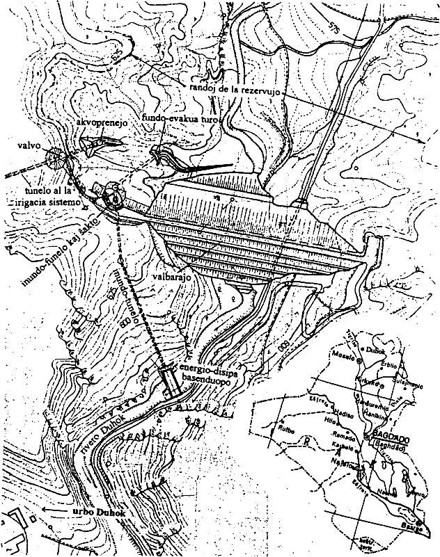 Fig. 1. Mapo pri la lokigo de la hidroteknikaj objektumoj de la vala akvorezervejo de Duhok laŭ la originalaj planoj, kun orientiga mapo de Irako (Poŝatlaso 1971) kun aldono de la urbo Duhok |
