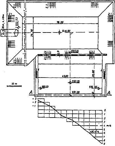 Fig. 5. La unue planita energio-disipa basenduopo kun la mezurita rapido-distribuo tra la elpaŝa sekco A-A |