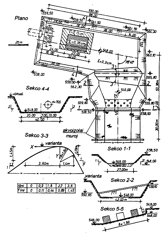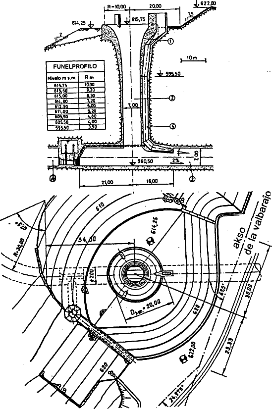 Koncerne la 55 metrojn profundan inundo-ŝakton (por kiu laŭ niaj teoriaj kaj model-studoj la necesa diametro estas 8,15 m) kaj la 390 metrojn longan inundo-tunelon (diametro 7,00 m), mi nur mencias, ke per konvena aerumado kaj preskribo de permesebla malglateco ε de la muroj de la funelo, de la ŝakto kaj de la tunelo (Fig. 4) ni certigis la eviton de la kavitacia erozio de la funelo-, ŝakto- kaj tunelo-muroj, kiun povus kaŭzi la granda rapido (ĝis ĉ. 25 m/s) kaj malalta premo de la fluo.