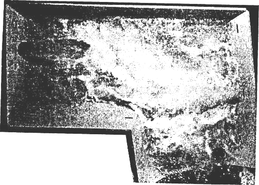 Fig. 6. La energio-disipa basenduopo proponita surbaze de la modeleksperimentoj. Supre: senakve. Malsupre: okaze de la trafluo de la maksimuma akvoflukso 810 m3/s, kun probablo 0,0001 |