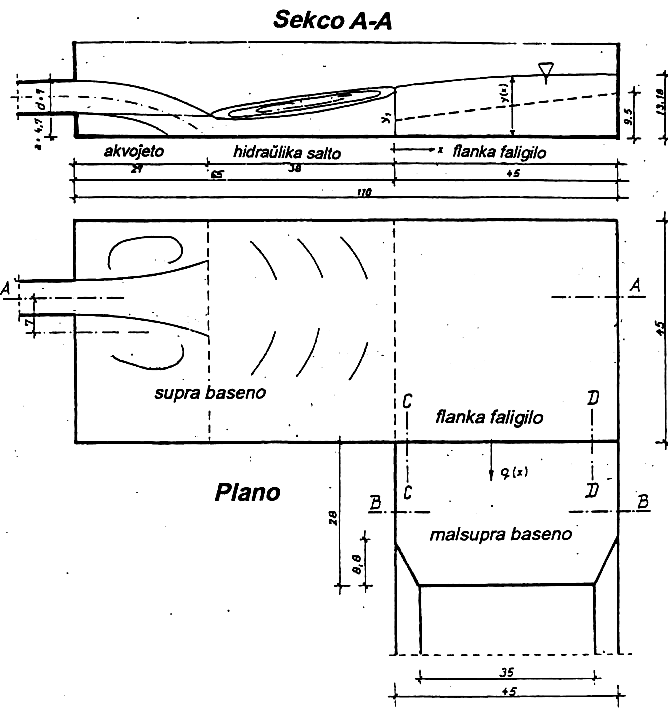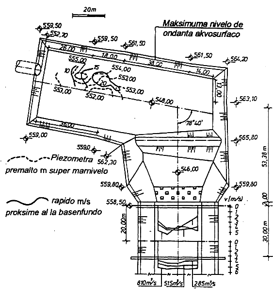 Surbaze de la modelstudoj mi trovis bonaj sekvajn modifojn: la basenduopo ŝoviĝu laŭflue dekstren per 7 metroj rilate al la akso de la inundo-tunelo, do estu 7 metra distanco inter la aksoj de la inundo-tunelo kaj la supra energio-disipa baseno, krome la flanka faligilo de la supra baseno havu kronon ne horizontalan, sed deklivan, leviĝantan laŭflue de la dekstra rando ĝis la maldekstra, kaj akson ne paralelan al la akso de la supra baseno, sed ortan al la akso de la malsupra baseno (Fig. 6). Ĉi kaze — laŭ la modeleksperimentoj — la elpaŝo de la akvo el la malsupra baseno en la naturan riverejon okazas praktike kun homogena rapido-distribuo, ne nur ĉe la maksimuma akvoflukso, kiu leviĝis al 810 m3/s, sed ĉe ĉiuj aliaj. La maksimuma rapido ĉe la elpaŝo nenie superpaŝas 4 ĝis 5,5 m/s, kion la natura riverejo, nature kovrita de ŝtonpecoj, povas elteni (Fig. 7).