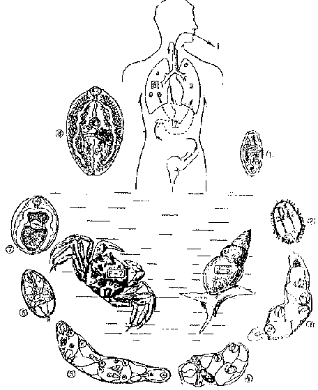 Bildo 10 Paragonimo vestermana (Paragonimus westermani): Freŝe demetita parazitoovo (1) en kiu disvolviĝas miracidio (2) kiu infektas limakon. En tiu "unua intera gastiganto" evoluas spurocisto (3), kiu produktas patrinajn rediojn kun idaj redioj (4) en kiuj post maturiĝo evoluas cerkarioj (5). La ŝtumpvosta cerkario (6) infektas krabon kiel "duan interan gastiganton", en kies histoj ili pluevoluas al metakarioj (7), la parazita stadio infekta por la "fina gastiganto". La metacerkario pluevoluas post ingesto al juna distomo, kiu migras en la pulmon kaj tie kreskas al adolta stadio (8). |
