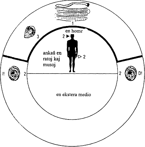 Bildo 3 Himenolepido nana (Hymenolepis nana): Plenkreska cestodo vivas en homa intesto. Per fekaĵo eligita ovo (2) estas senpere infekta por la homo mem pro enhavanta onkosfero (2), kiu pluevoluas en la intestokanalo histo al cisticerkoido (3) kaj disvolviĝas al adolto (1). |